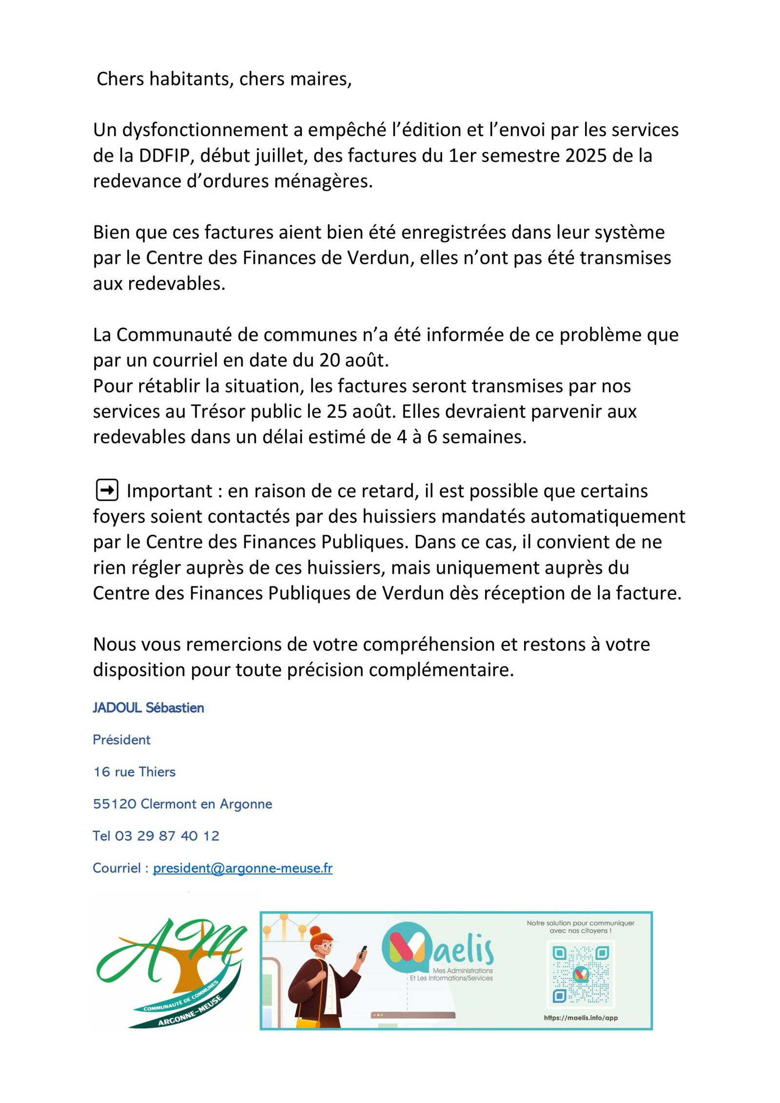 DYSFONCTIONNEMENT SUR L'ENVOI DES FACTURES DES ORDURES MENAGERES